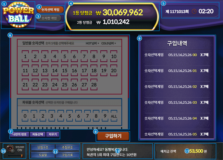 일반볼 5개( 1~28개) + 파워볼 1개 = 총 6개 숫자를 선택하는 게임