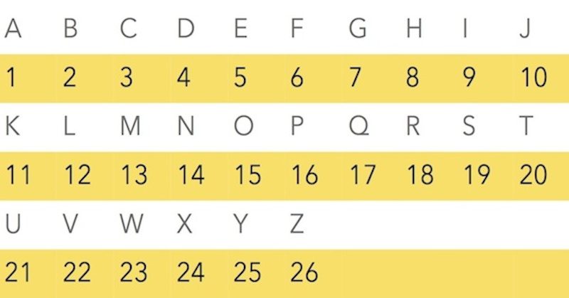 가장 간단한 경우는 A=1, B=2, ..., Z=26과 같이 알파벳 문자를 숫자로 직접 매핑하는 것이다.