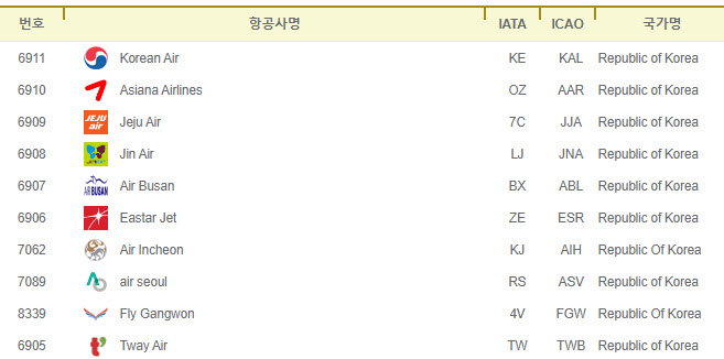 모든 항공사는 고유한 2자리 코드(항공사 지정 코드)를 부여받아 사용하는데