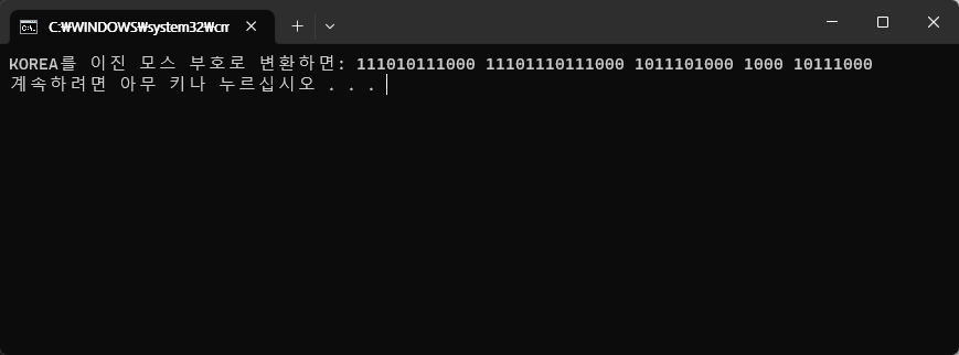 Console.WriteLine($"{input}를 이진 모스 부호로 변환하면: {binaryMorse}");