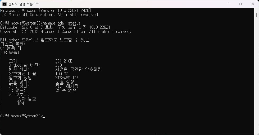 자신의 컴퓨터에 암호화 소프트웨어, 비트로커가 On 된 것인지 아는 방법은 아래처럼 관리자 권한으로