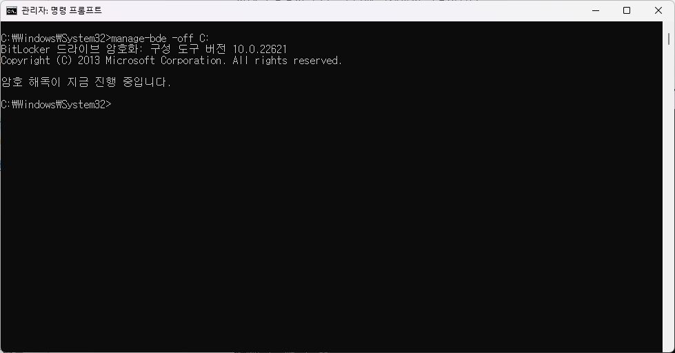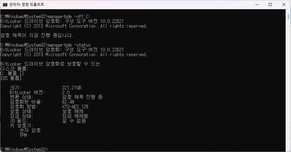 비트로커를 Off하고 싶다면 아래처럼 드라이브 이름을 포함한 명령을 입력하면 꺼진다.