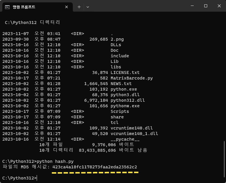 이제 이 파일의 MD5 해시를 파이썬 코드로 만들어보자.