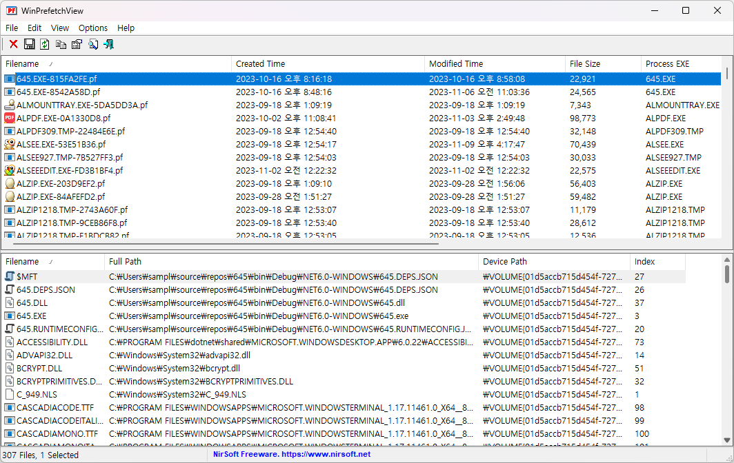 프리페치 파일 목록(리스트)에서 아이템을 선택하면 세부 사항이 나타난다.