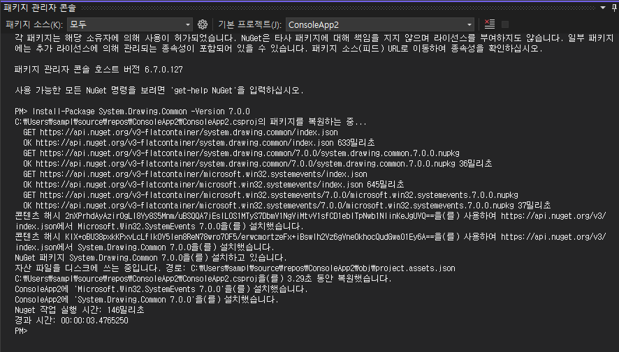 ConsoleApp2에 'Systehttp://m.Drawing.Common 7.0.0'을(를) 설치했습니다.