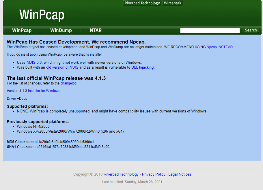 다음의 WinPcap 웹에서 install for Windows를 통해 추가 설치를 해줘야 동작한다.