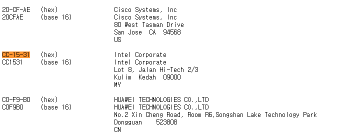 IEEE에서 찾아보면 아래처럼 Intel의 OUI임을 확인할 수 있다.